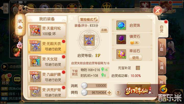 首先提到的就是令大伙悲喜交加的启灵玩法,虽然通过启灵可以让装备获得更多灵属性加成并拥有绚烂的外观特效,但随着启灵等级的提升成功率会越来越低,所以不稳定是启灵玩法的最大特质!因为不稳定,所以有的时候投入金钱并不能带来回报,自然在启灵时个人建议只把武器跟鞋子强怼至21级,其余部位装备启至15级即可,至于剩下的几级在日后游戏时可慢慢启灵(15级之后启灵带来的收益并不可观,此时将金钱投入到其它强化渠道会更合理)。