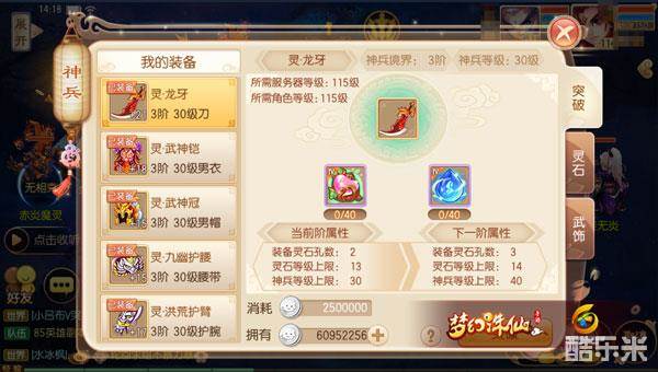 不过就算装备突破不怎么消耗经济,但在突破过程中我们还得注意一点——那就是装备的突破方式选择:在给装备进行突破时,不仅每提升一级都能获得定额的属性增长,突破阶级时还能增加灵石镶嵌槽以及灵石等级上限(另一种获得属性加成的途径),因此在进行突破时建议逐一提升(切勿雨露均沾),至于突破顺序建议为武器→鞋子→护臂→头盔→衣服/腰带。