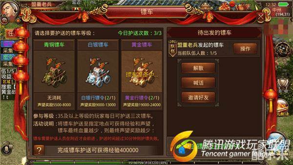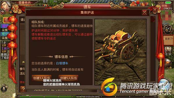 大家都知道押镖可以选择组队押镖和单人押镖,如果大家押送青铜镖车,被截取损失并不是特别大!但是如果押送白银、黄金镖车,建议大家组队押镖!首先创建或者加入一个五人队伍,寻找高等级高战大神庇佑!最好是本服排名靠前的行会,这样能起到一定的威慑作用!