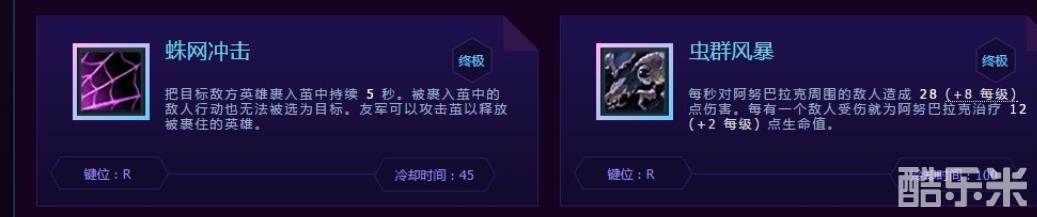 虫群风暴(R1):阿努巴拉克基本上都只会考虑点这个大招,只要开了它的时候你的血线不是太低,基本就不用担心死的问题了,极大地弥补了大甲虫脆的缺陷。人很多的话治疗量惊人,想象一下抗一波小兵1V2的情景,如果对手很多的话伤害也特别惊人。恢复是伤害的一半,再怎么说伤害也不低。准确的说是拉血差的,而且个人感觉伤害真的好高。。。