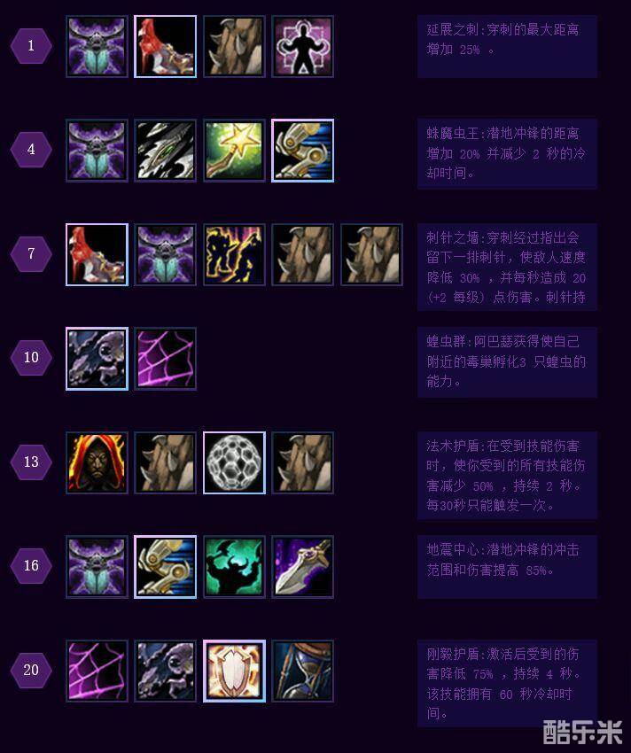 硬化甲克(W):简单粗暴的技能,虽然效果不华丽,但是对阿努巴拉克来说还是不错的,经过强化之后也可以变得更强大。,后期天赋点了可以开盾的同时又输出。不过和泰瑞尔的W比起来确实薄了很多。