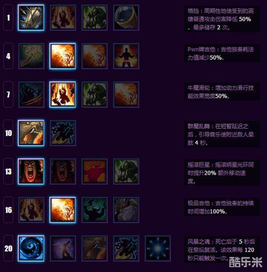 第六层(16级):专业吉他。E技能持续时间翻倍;这层天赋效果提升比较可观,相当于双倍回复。