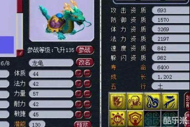 童子加龙龟,很可惜出了副宠,成长1.202.防御资质1570,体力资质3269,速度资质842,技能法术防御,死亡召唤,水攻,反震,高吸收加灵灯侍者的特殊技能,如果是童子那就是8技能了,资质还不好,感觉又没什么运气了。