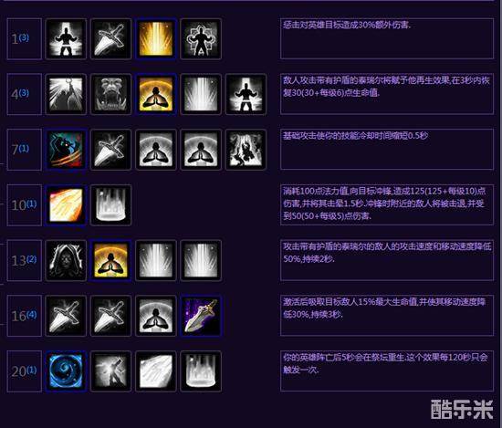 第二层,我一般是选3,开盾被打回血,第2,3,4个都是可选天赋,第2个吸血的作用是打野混线保持高血量,便于打野和混线后参加团战,天赋4是最大化输出,不过鉴于泰瑞尔某些时候都是面对单个对方英雄,所以性价比不高,但是走纯输出路线,也可以点