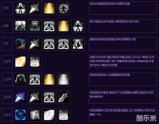 灼热攻击:普攻伤害提高50%,持续5秒。CD25秒,16级平砍142变成213? 我的理解,泰瑞尔抓单追杀,输出已经够了,团战是以跟站得住为主。