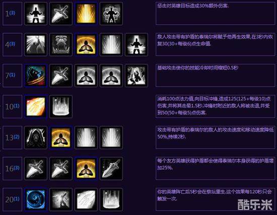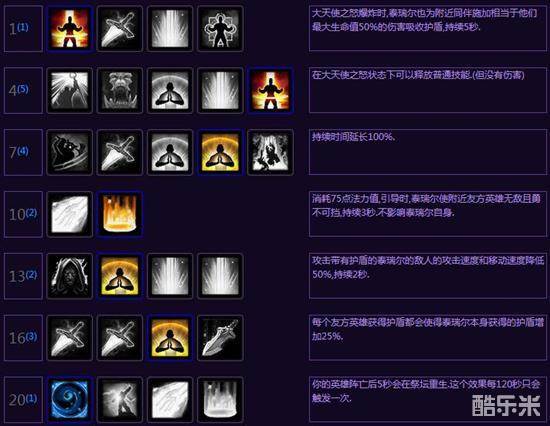 狂热:护盾持续时间由4秒提升到8秒。看过有的帖子很提倡点这个技能,个人实验下来并不提倡。我给泰瑞尔的定位,在团战中,其中一个重要的作用就是吸收一圈火力后撤一下等CD,4秒的盾完全够用。至于队友的盾,16级套一下才230,4秒过了就过了吧。