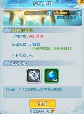 这里就是挂机的区域界面,可以看见自己随机获得的道具以及经验量。点击黄色挑战按钮进入挂机模式。自机就可以退出游戏或者切换网页去做其他事啦。