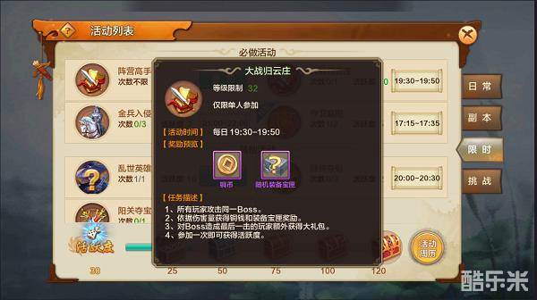 归云庄活动类似于世界BOSS,开启时间有限定,开启后所有玩家可以一起打,最后结算看个人伤害排名给与奖励。奖励物品主要可以获得铜币和装备宝匣,这个要求不是很高,混一混还是可以的,多多注意BOSS的技能即可。