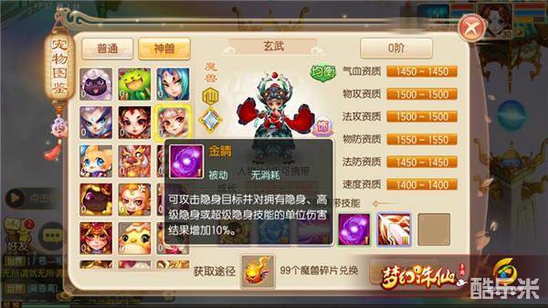 2)虽然魔兽玄武的速度资质比不上神兽,但是在可以培养成隐攻型宠物中它的速度还是非常厉害的,所以在战斗中的出手率也是可以保障的。