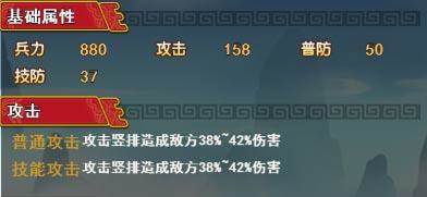 兵力880,攻击158,普防50,技防37。这个基础属性不是很高,只能说是标准吧。