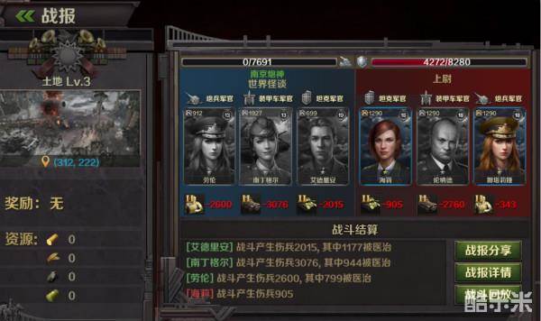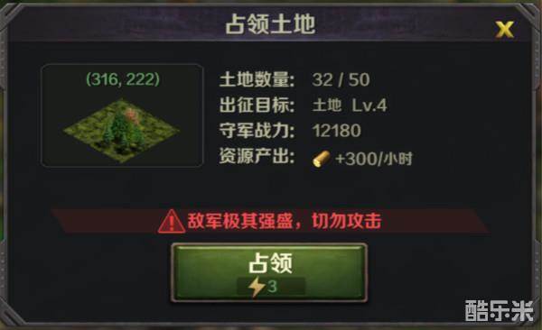 但是,看到高级是打了双引号的吧,怪谈蜀并不提倡你盲目的去占领高级土地,而是要衡量自己的战力到底够不够守军的战力高,最直观的就是你可以留意提示,如有标红的字“敌军极其强盛,切勿攻击”,基本上来讲你就可以放弃攻击了,因为失败了不仅没掠夺得资源,还会损兵折将,得不偿失了。