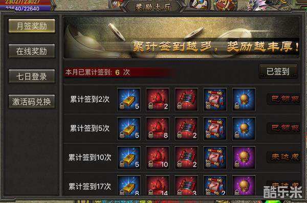 月签奖励:每月登陆游戏签到一定天数可获得对应奖励,每月所有奖励领取完后次月重置可再次签到领取