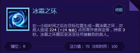 1冰霜之环(R):在一小段时间后,在目标位置生成一圈冰霜之环,对敌人造成440x24点伤害并使其定身,持续3秒,冰霜之环随后持续3秒,冰冻任何接触到的敌人。