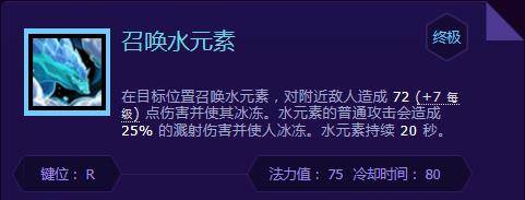 2.召唤水元素(R):在目标位置召唤一个水元素,对附近的敌人造成135x7点伤害并使其冰冻。水元素的普通攻击会造成110x6点伤害和25%的溅射伤害,并使敌人冰冻。