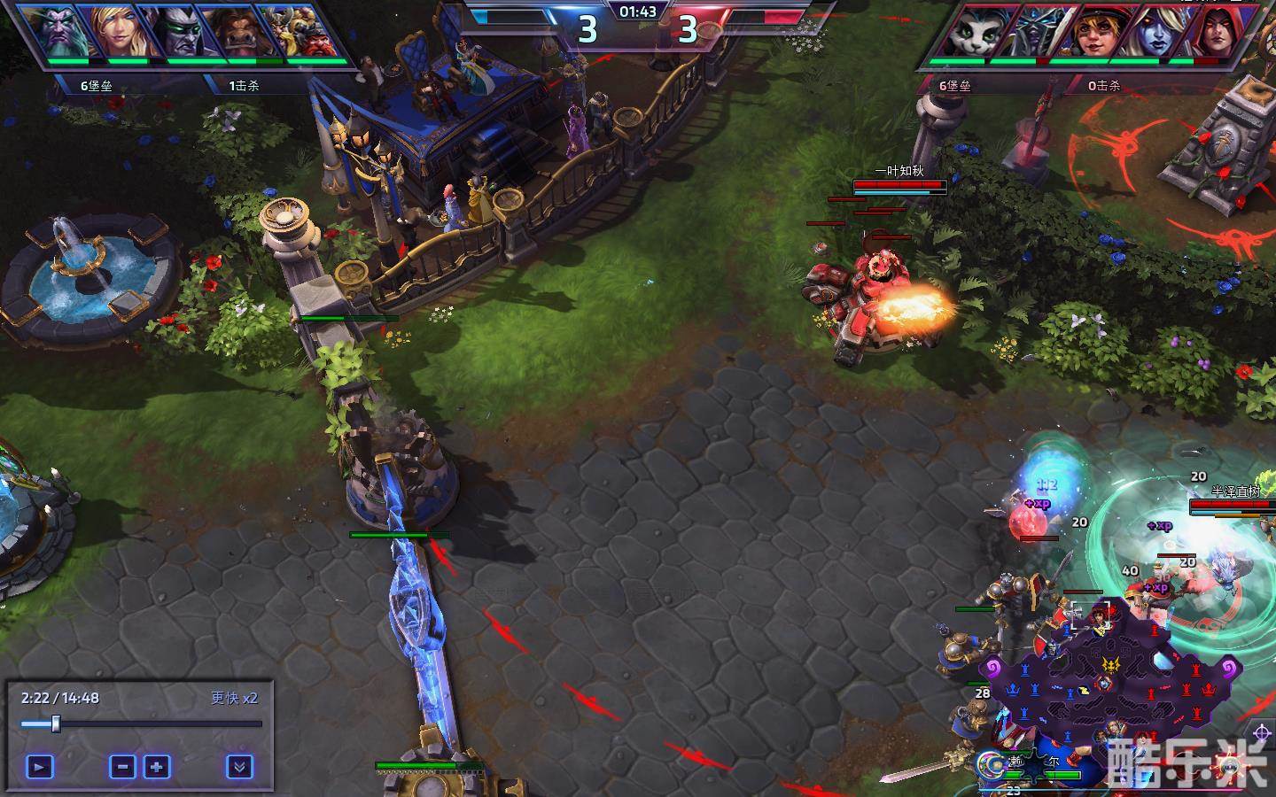 这就是一场正确对抗维京人的比赛,212分路,1分40秒,坦克已经推掉上路一个炮台,而缺乏推进能力的维京人队友,并没有变通的进行上路GANK,下路炮台也只打掉一一半的血量。