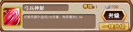 弓兵神射:对骑兵额外造成10%伤害,每级增加0.5%