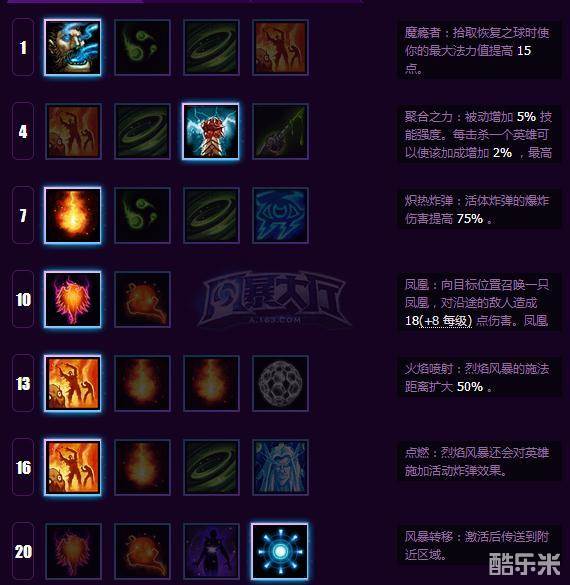 争议较大的就是凯子的13级天赋,到底选择连锁炸弹还是火焰喷射呢?基于目前版本趋势,个人觉得除非对面是4近战甚至5近战阵容,并且没有泰瑞尔、阿努巴拉克等突进英雄的前提下才考虑点连锁炸弹。之前版本还对连锁炸弹天赋进行过削弱(连锁炸弹天赋不会对已经受到活动炸弹效果的敌人再次施加活动炸弹效果),不推荐点。火焰喷射50%的射程提升效果还是很明显的,未见凯子先中Q的情况也让拥有凯子的局被戏称为“找凯子”。