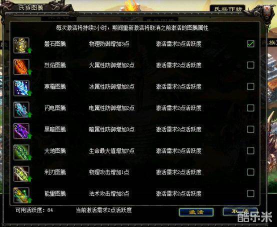 当氏族将图腾建设好之后,全体氏族成员均可以通过消耗个人活跃度以及少量的其他资源将氏族图腾激活。激活后的图腾会对玩家增加相应的属性加成,其激活时间将持续2个小时。