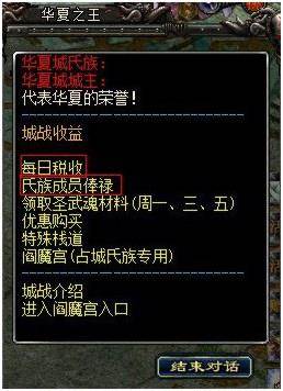 占城氏族的氏族长每天可以在NPC“华夏之王”【天圣原(238.314)】处领取税收,氏族成员每天可在NPC“华夏之王”处领取俸禄。