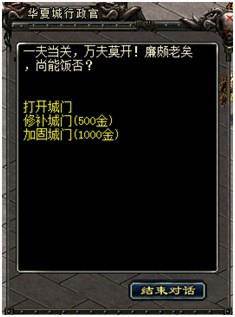 守城方可以通过NPC“新华夏城行政官”打开城门,或者对城门进行修补、加固的操作用于巩固防御。
