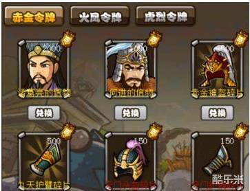 6.不同的令牌可以在兑换页面兑换不同的道具、装备、英雄,赤金令牌更可以兑换金色诸葛亮、何进信物和金色装备碎片!