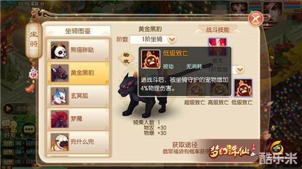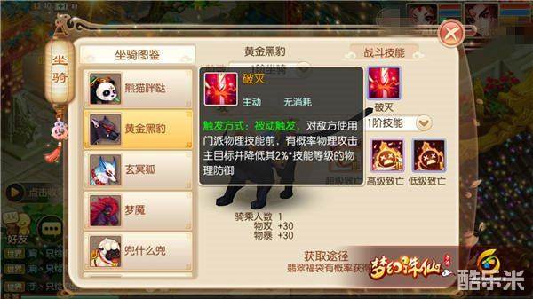 坐骑的技能分为两种一是主动技能,而是被动技能。在战斗的时候玩家可以获得它的主动技能,而被它守护的宠物则可以获得它的被动技能.黄金黑豹的主动技能是“破灭”对敌方使用门派技能前,有概率物理攻击主目标并降低其2%*技能等级的物理防御。这个技能在战斗中的非常使用,可以有效的削弱敌方的防御能力。