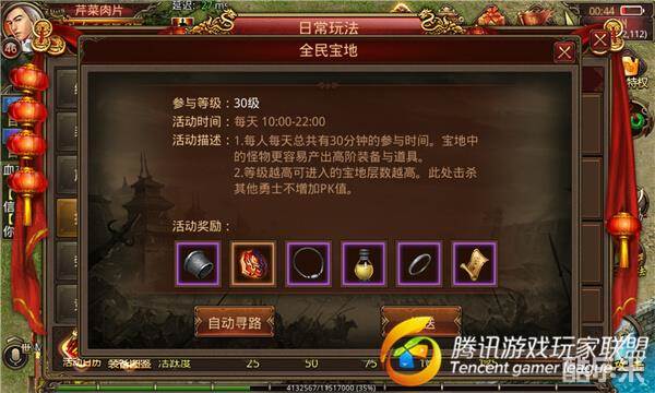 全民宝地每人每天有30分钟参与时间,宝地中的怪物更容易产出顶级装备与道具。等级越高可进入的宝地层数越高。此处允许PK但不增加PK值。击杀怪物很大几率掉落神兽魔盒碎片!!!一定几率掉落顶级戒指、手镯、项链、洗练符、祝福油。