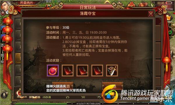 每周一、三、五、日19点至20点,在19点半以前消耗金币进入地图参与落霞夺宝。落霞夺宝中的BOSS击杀后必掉宝盒,特别注意的是,击杀BOSS后玩家有5分钟的时间拾取,超过5分钟任意玩家可以拾取。很多玩家爆出了50级橙色衣服、高级技能书、强化技能灵丹。