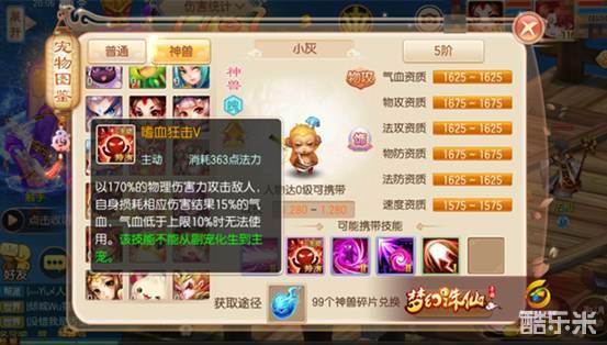 而被定义为物攻型宠物的小灰在属性方面与其它神兽相比并没有啥优势,只是专属技“嗜血狂击”具有不错的增伤效果,不过在个人看来该技能实用性一般:大伙都知道宠物受资质影响很难拥有高额杀伤力,自然就算依靠“嗜血狂击”的增幅也难对人物角色造成致命打击。并且该技能在释放时存在气血要求,也就使得该技能在高强度的竞技场中很难有机会施展,换句话来说在打造小灰时不宜围绕“嗜血狂击”进行技能搭配(该技能在化生时无需铭记)。