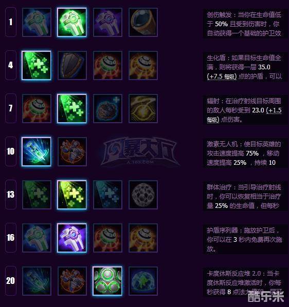 第五层:也是个基本固定的天赋:群体治疗,Q奶别人的同时奶自己,极大幅提高自保能力。。。基本不出意外都选这个天赋。己方双奶的情况下可以点Q治疗量提高,主保一个人,比如桑亚,大主教,蛋哥,Q减攻速性价比不如前两个,法术护盾pass。