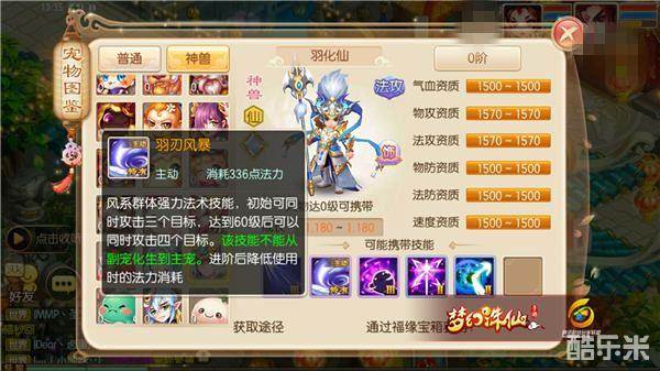 神兽的技能和魔兽相比,神兽在技能上有不小的优势。羽化仙的初始技能有5个分别是:超级法术连击,羽刃风暴,超级震慑,高级怒火,高级魔法反击。这里就不得不提羽化仙的专属技能“羽刃风暴”风系群体法术技能,可以同时攻击6个目标,达到60级后可以攻击4个目标。这个技能和其它的群法技能相比,攻击目标多一个。可以说羽化仙打出的伤害要超过其它群法宠。相信小伙伴看到群攻技能想到的就是将羽化仙培养成一只状态宠,但是将羽化仙培养成状态宠太大材小用了,因为羽化仙自身的优势非常适合培养成法攻宠,还是一只在战斗中能抗揍能打出爆炸输出的法攻宠。