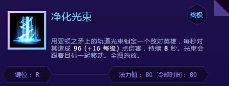 团战中用来限制后排输出,或者集火前排。光束落下的时候至少能给目标造成1秒左右的伤害,用来补刀的成功率也是非常高的。