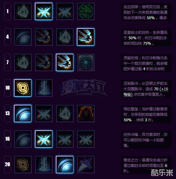 纯输出加点,兼备AOE和单体突进;致命迅捷+太阳能灵刃不仅躲技能利索,还具备高效的AOE和补刀能力。后期三连击+狂热冲锋+意志之力的搭配能突进、输出高,刷盾也快速。