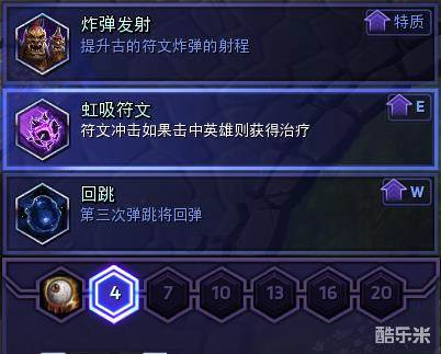这层一定选回弹。回弹的效果是,W的第三段伤害会回到第一段的位置,也就是一个位置打两下。这个天赋的主要意义在于拆建筑和打野,可以保证目标吃两段W,直接让W的输出提升了一倍以上。