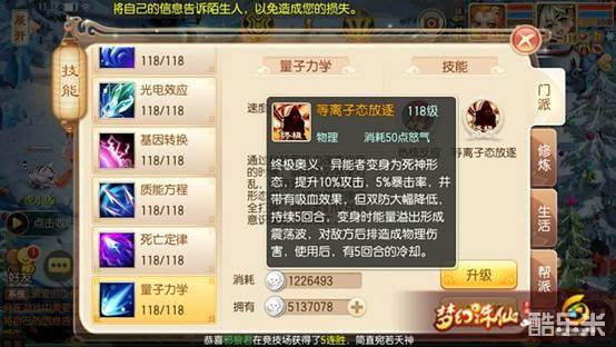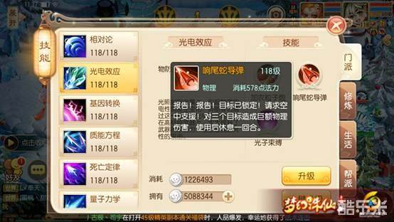 等离子裂变:将原子核分裂,从而发起能量猛烈的物理攻击。初始攻击2个目标,在技能30/60的时候增加一个目标。每个门派特有的初始技能,适用于PVE战斗,基本都是挂机抓鬼用,全力加点的情况下,不属于任何物理输出门派。响尾蛇导弹:对三个目标造成巨额物理伤害,使用后休息一回合。感觉这个技能像群秒版的后发先至技能,PVP战斗中用于高速守尸应该是个不错的选择吧。当然咯,用来打伤害也是一个很好的技能。加农粒子炮:对目标造成俩次物理攻击,这个技能有点像焚香的双龙物理版,不过没有血量限制,但是物理门派的技能是可以被防御的,各位少侠视情况而定。