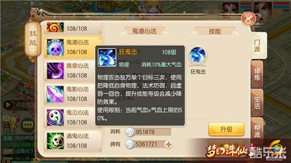 鬼道心法:增加物攻和法攻,包含技能狂鬼击。
