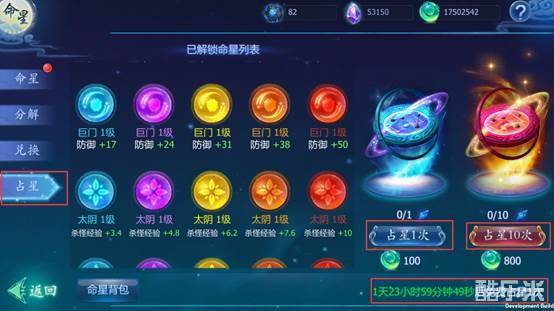 占星是获得命星最快捷的方式,每次占星需要1个占星道具或者100非绑定仙玉,每次占星必定获得1个【命星碎片】,占星10次必定获得1个橙色的命星。在没有占星道具的情况下,如果一次性占星10次则只需要800仙玉,可以节省很多仙玉哦,而且每隔48小时系统将会赠送一次免费的占星机会,但是次数不会累计,仙友们要记得使用哈~
