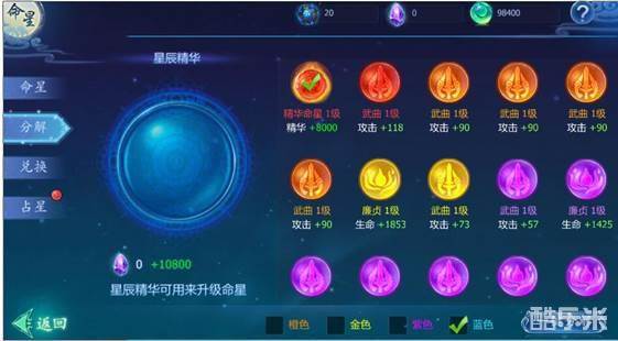 除了类型外,每种命星还会有7个品质等级,分别为:白、绿、蓝、紫、金、橙、红,白色为最低阶,红色为最高阶,而且命星是可以通过消耗【星辰精华】来提升等级,最高可以达到100级哦~
