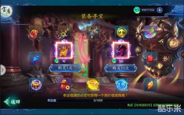 【寻宝奖励】:每次寻宝可以获得一个伙伴进阶丹,还可以获得一个额外的随机道具。随机道具有可能是稀有橙色装备、七彩羽毛、双倍经验丹、万兽甲灵石等。每次购买都可以累积一定的幸运值,幸运值满1000后必定获得一个高价值的道具。