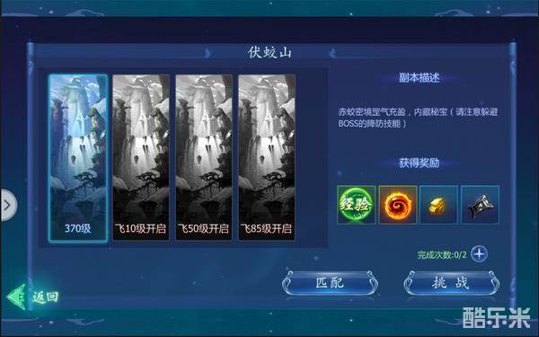 【副本介绍】:副本分为4个不同的难度分别是370级、飞10级、飞50级和飞85级。因为是组队副本,需要创建队伍后才能进入。
