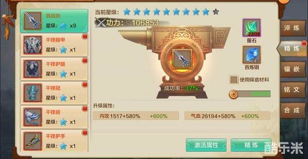 精炼的难度可就比淬炼高得多了,因为精炼虽然强化只要用到铜币,但不像淬炼一样100%成功,随着精炼等级的提高,和淬炼一样,会有额外属性激活,但是精炼成功率也会随之下降。一次强化失败不仅白白损失了金币,精练等级也会下降,但是游戏还是很良心的,连着强化失败两次之后就可以在下次强化成功前都不需要保底材料,但是这样还是不保险的,这时候就需要用上保底材料萤石和百炼钢了,使用之后就算强化失败精练等级也不会下降。