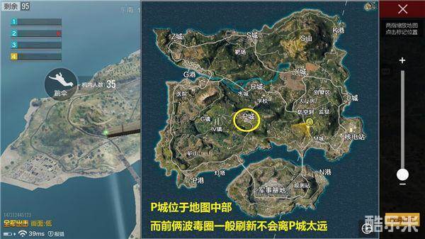 有人会有疑惑,为什么要选择P城落脚?而不选择军事基地之类的地方?其实我们可以从图中看出,P城是位于地图的中心位置,而在尖兵试炼中,毒圈的刷新是没有缓冲时间的,而是一个毒圈接着一个毒圈来!而我们在P城落脚,安全区一般来说不会与P城离的太远,我们可以迅速的转移,不用在扛着毒走。