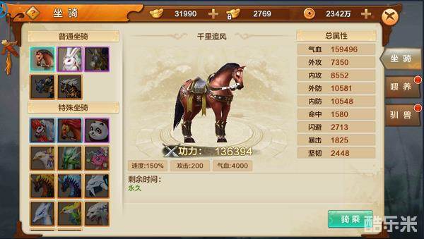 第一个选项界面其实就是所有的坐骑种类,每个坐骑都有一个自带的属性,比如千里追风马自带速度150%、攻击200、气血4000,不同种类的坐骑自带的属性都会有差异,该界面还有个总属性,总属性是可以通过培养提升的,这个等下面的两个选择再说。