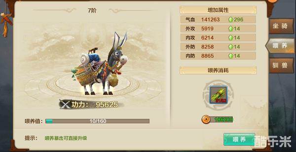 喂养坐骑需要消耗口粮,当喂养值满了的时候坐骑就会升级并且增加属性,而且这个属性是永久性的,就算是下面的这只驴的期限到了,也不会影响到属性值。喂养升级有阶级和等级,每升级10级换算成1阶,也就是9级的喂养值满了后就变成1阶0级,里面还有个设定,就是在喂养的时候出现暴击,会直接提升1级,脸好的玩家等级就能蹭蹭的往上涨了。在升级的同时增加的属性值只有5中,分别是气血、外功、内功、外防、内防的提升,能大大提高自身的战力,至于暴击之类的其他属性则没有,而总属性里面的命中、闪避、暴击、坚韧则是在驯兽那里才能获得提升。