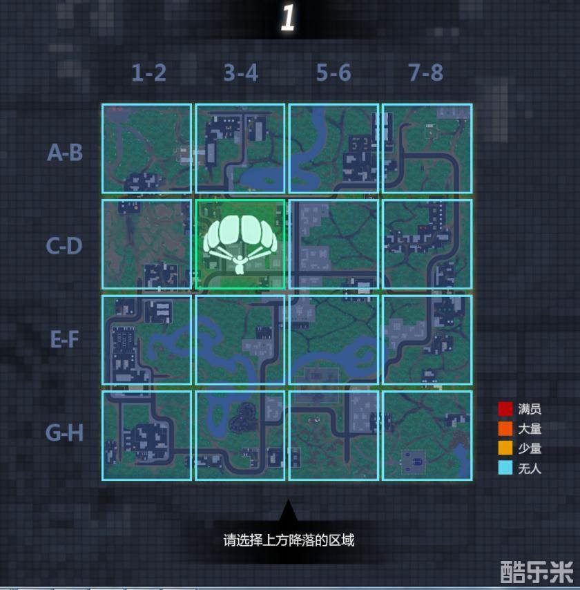 选择人物进入游戏后,有10秒可以选择跳伞位置,鼠标悬浮的有降落伞图标的位置就是我们可以选定的降落点,选择后,该图标会不断闪烁,以提示即将降落点的地点。
