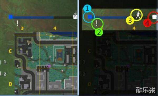 3. 表示玩家离安全区的远近位置,若被蓝色进度条赶上,就表示你已经开始吃毒了。若玩家在安全区内,则白色小人会在“4”号icon表示为半透明。