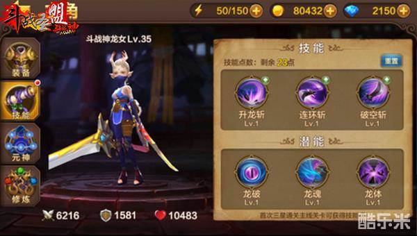 主角一共可以学习6个技能,“技能”代表主动技能,“潜能”代表被动技能。主动技能需要技能点进行提升,首次三星通关主线关卡可以获得技能点。被动技能不需要技能点,当角色达到一定等级后,被动技能自动升级。