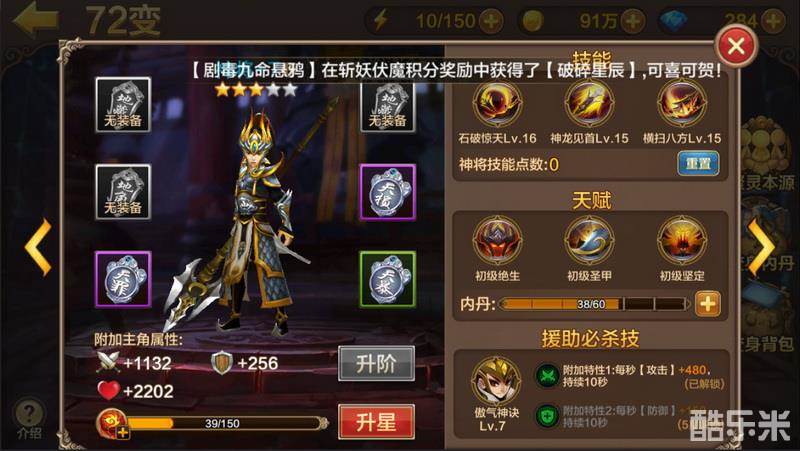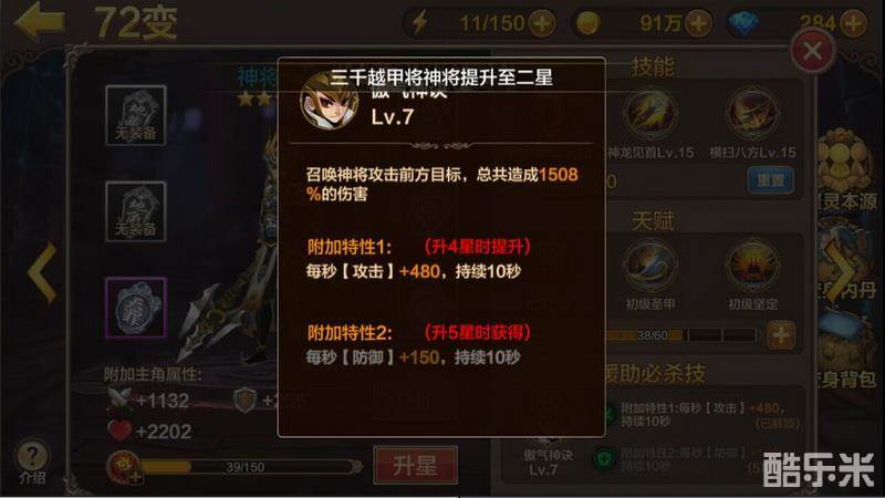 然后再来看看必杀技,必杀技也是以多段攻击为输出手段,而且升星特效还能加攻加防,不失为一个好辅助技能。