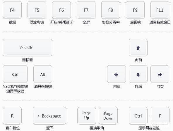 | R 键 | 赛车复位,如果赛车驶离赛道后可用该键复位 |