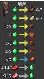 村民也有职业之分。上面那张图的村民的职业是“农民”,交易配方以食物为主。(P.S.灰色箭头为常见配方,黄色是较常见,蓝色是罕见)